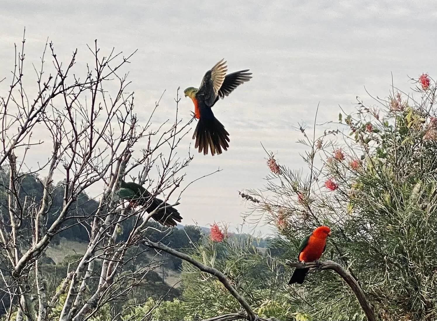 Scarlet Honeyeater, Brown-Headed Honeyeater, Lewin’s Honeyeater, Crested Pigeon, Peaceful Dove, Bar Shouldered Dove, King Parrot, Eastern Rosella, Crimson Rosella, Red Rumped Parrot, Scaly Breasted Lorikeet, Rainbow Lorikeet, Galah, Cockatoos, Noisy friarbird, Yellow-Tailed Black Cockatoo, Pipit, Willie Wagtail, Satin Flycatcher, Australian Magpie, Magpie Lark, Laughing Kookaburra, Various Crows, Brown Cuckoo Dove, Satin Bowerbird, Reb Browed Finch, Superb Fairy Wren, Variegated Fairy Wren, Eastern Yellow Robin, Turquoise Parrot, White-Winged Chough, Masked Lapwing, Banded Lapwing, Brown Quail, Wedge Tailed Eagle, Welcome Swallows, Eastern Spinebill, Channel Billed Cuckoo, Eastern Koel, Fuscous Honeyeater, Yellow Faced Honeyeater, Southern Whiteface, Black Faced Cuckoo Shrike, Drongo, Noisy Miner, Yellow-Rumped Thornbill, White Eared Honeyeater, Tawny Crowned Honeyeater, Pied Butcher Bird, Sacred Kingfisher, White Headed Pigeon, Tree Martin, Grey Fantail, Brown Gerygone, Grey Shrike-Thrush, White Bellied Cuckoo Shrike, Little Friarbird, Pheasant Coucal, Wonga Pigeon, Azure Kingfisher, Southern Emu Wren, Top Knot Pigeon, Australian Hobby, Pacific Black Duck, Little Pied Cormorant, White-Fronted Honeyeater, Jacky Winter, Fairy Martin, White Faced Heron, Peregrine Falcon, Whistling Kite, Crescent Honeyeater, New Holland Honeyeater, Collared Sparrowhawk, Silvereye, Regent Bowerbird, Australasian Figbird, Black Shouldered Kite, Eastern Barn Owl, White Plumed Honeyeater, WhiteNaped Honeyeater, Nankeen Kestrel, White Browed Scrubwren, Australian Wood Duck, Red-Backed Fairy-wren, Varied Triller,